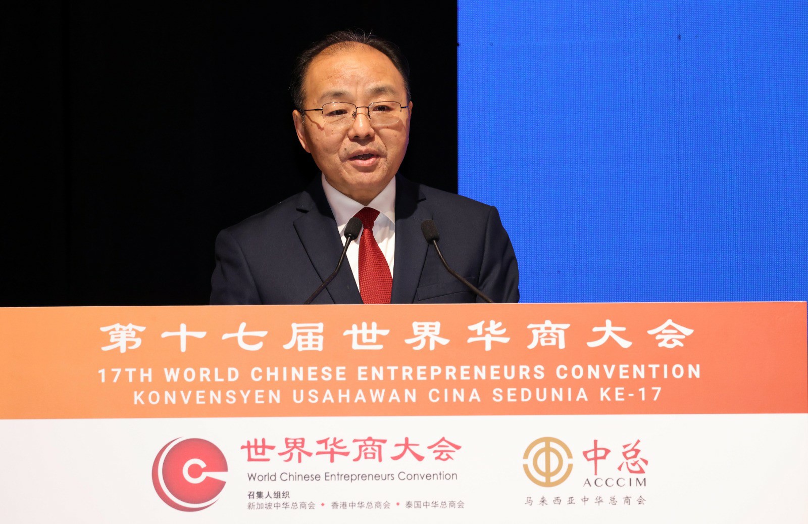 中国驻马来西亚大使欧阳玉靖为第17届世界华商大会提出3项倡议,包括“投资中国,就是投资未来”、“立足当下,深挖合作潜能”,以及“跨别危机,共创美好的未来”。